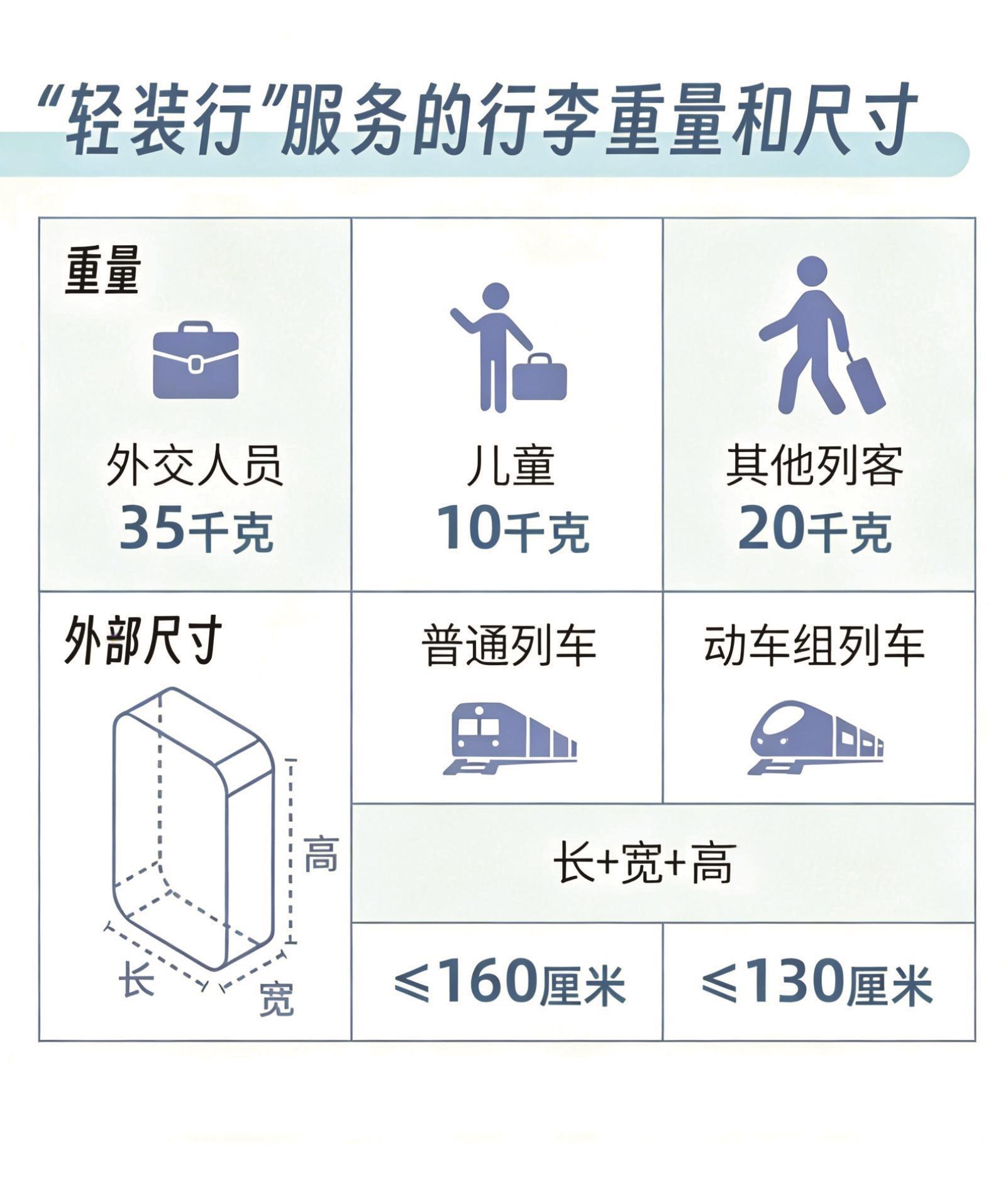 行李需符合《国铁集团铁路旅客运输规程》的重量尺寸规定:儿童旅客10公斤、外交人员35公斤、其他旅客20公斤;普速列车行李长宽高之和不超过160厘米,动车组列车不超过130厘米。同时,还需遵守《铁路旅客禁止、限制携带和托运物品目录》要求。