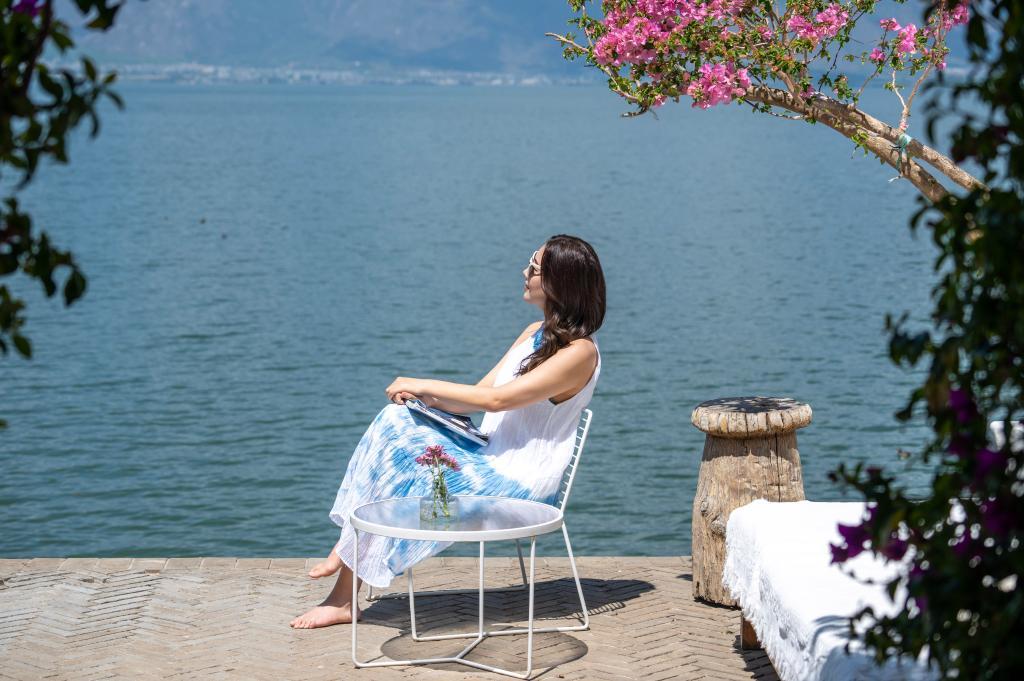 一名游客在大理洱海边晒太阳。新华社记者 刘莲芬 摄