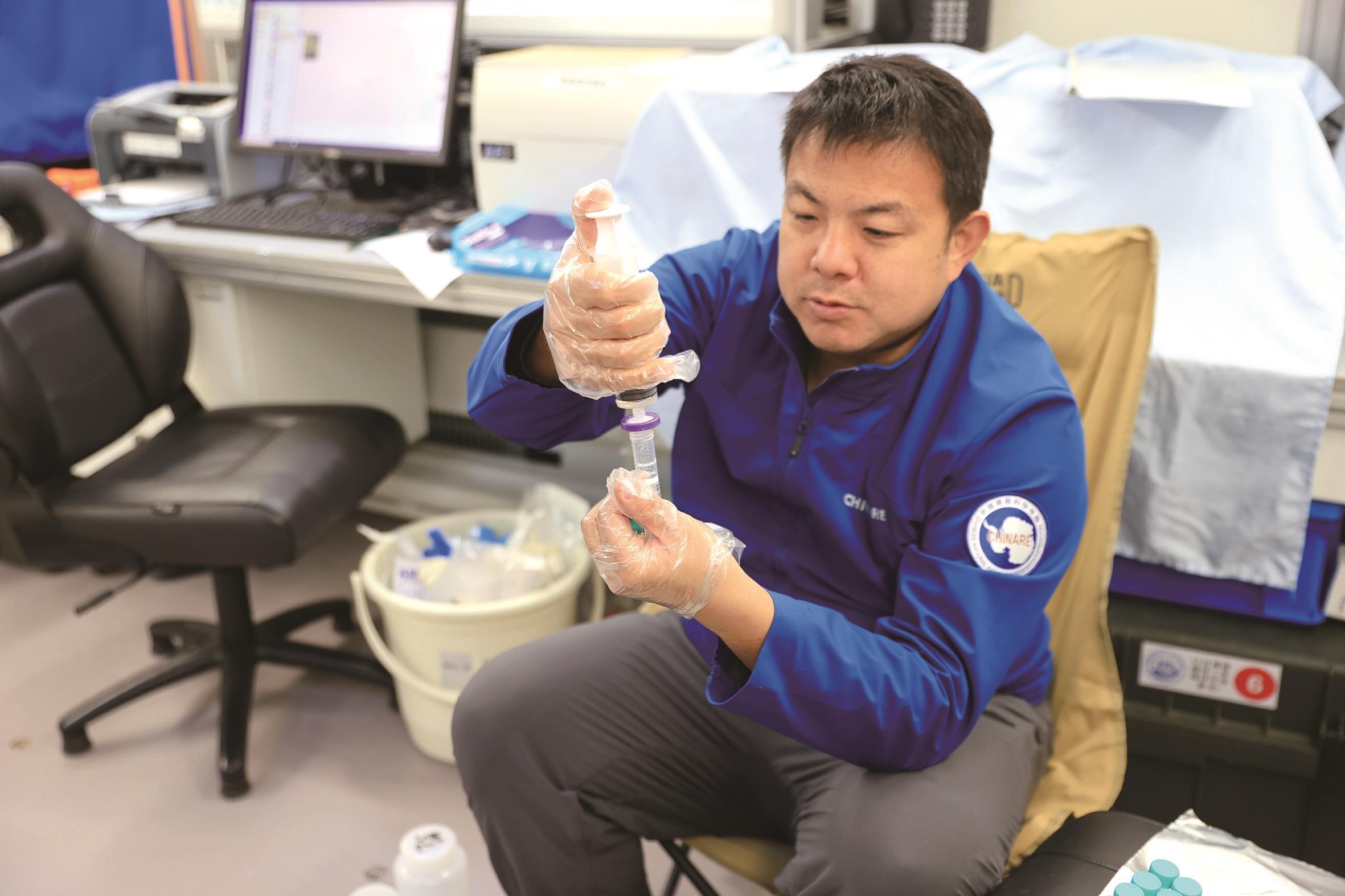 已经参加过3次南极考察的朱长凤,本次考察中负责溶解有机碳和颗粒有机碳的采样。尽管晕船的不适始终相伴,但每到一个站位,他都精神抖擞地出现在CTD面前,认真完成采样任务。“溶解有机碳和颗粒有机碳是海洋碳循环的核心载体,是反映海洋碳汇能力的重要指标。”朱长凤说,南大洋碳汇强度的变化与全球温室气体浓度息息相关。